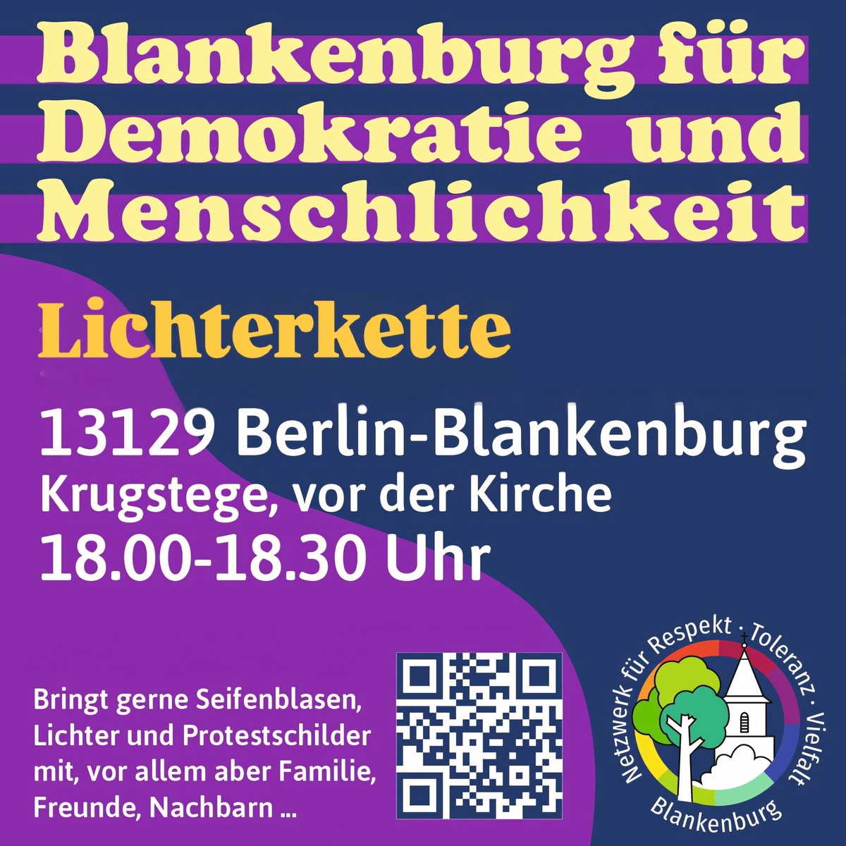 Bringt gerne Seifenblasen, Lichter und Protestschilder mit, vor allem aber Familie, Freunde, Nachbarn…